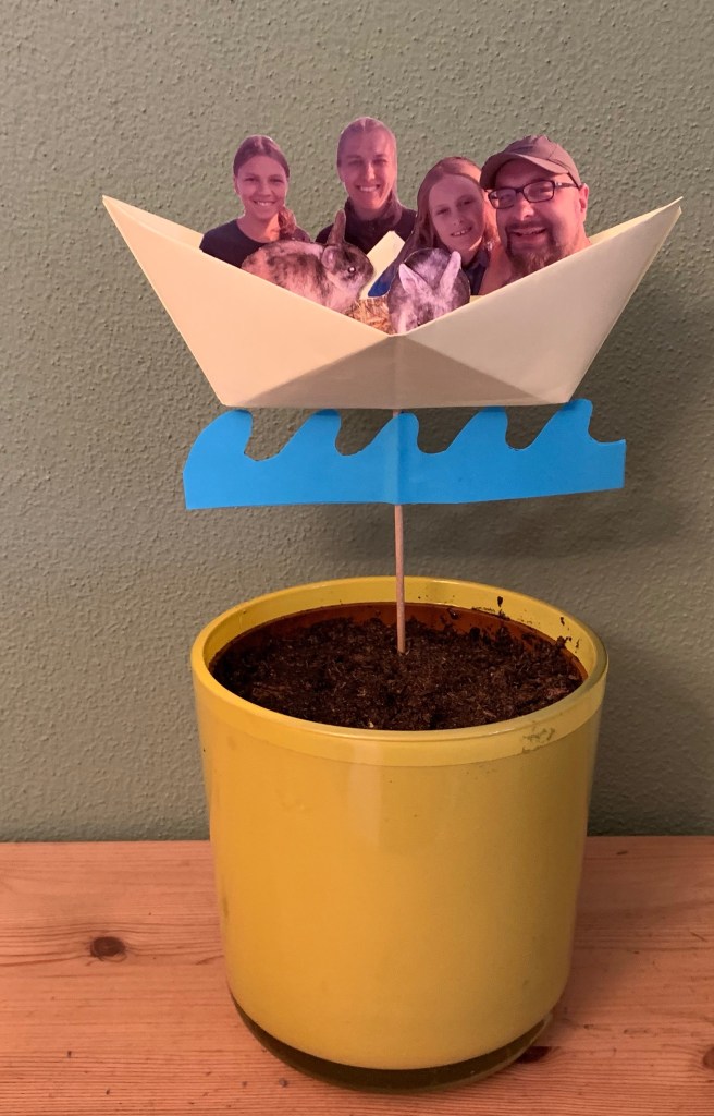 Wer möchte, kann seinen Blumentopf bis die Pflanzen wachsen, ja noch mit einer selbstgebastelten Arche verschönern. Faltet einfach wie auf unserem Beitragsbild ein Papierschiffchen, beklebt/ füllt es mit ausgeschnittenen Bildern Eurer Familienmitglieder und Haustiere, befestigt es an einem Hölzchen (z.B. an einem Schaschlik-Spieß oder an einem Eisstäbchen) und fertig. Steckt nun Eure kleine Arche in den Blumentopf. Und schon wirkt er nicht mehr so leer und erinnert uns daran, dass alles Warten irgendwann vorbei ist.